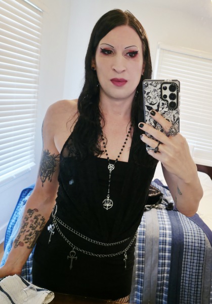 I’m Countess Lilith — a gothic, androgynous Domme with a vampiric aesthetic, smooth skin, full lips, and a commanding presence.